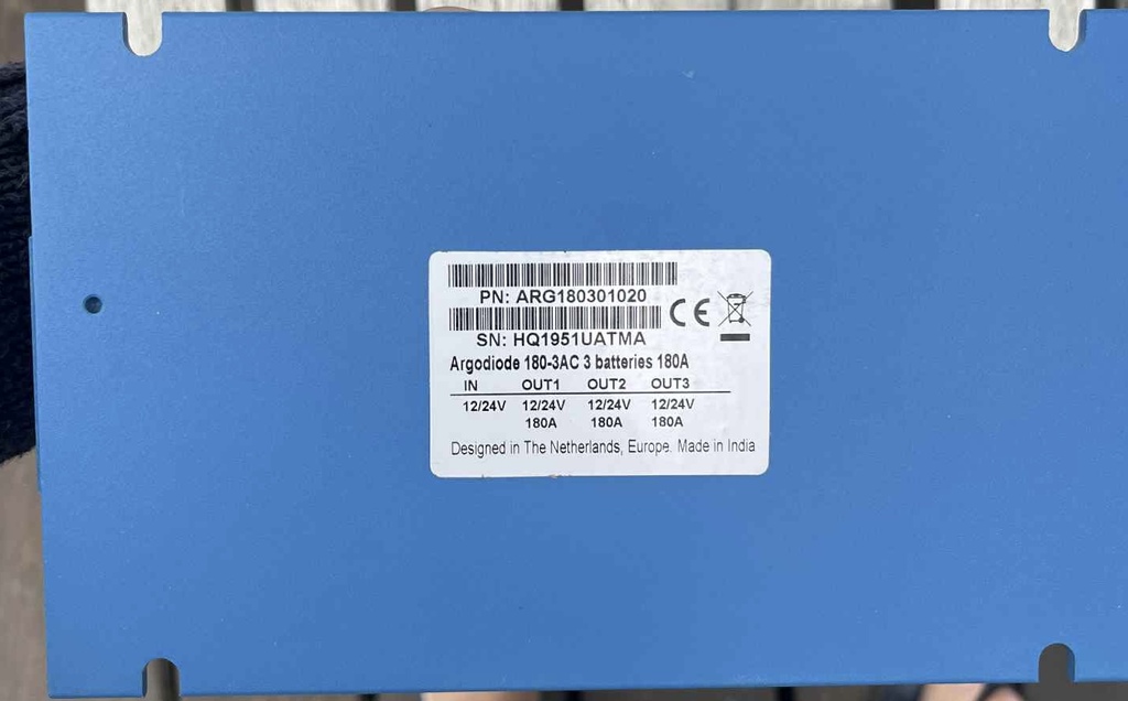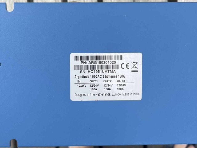 Je vends cet isolateur de batterie Victron Energy ArgoDiode 180-3AC (~2019, SN : HQ1951UATMA), leader en gestion électrique marine. En état excellent : ports propres, testé OK. Idéal pour voilier/moteur inboard 10-15 m – charge 3 batteries (démarrage/service/thruster) d'un seul alternateur sans décharge croisée.