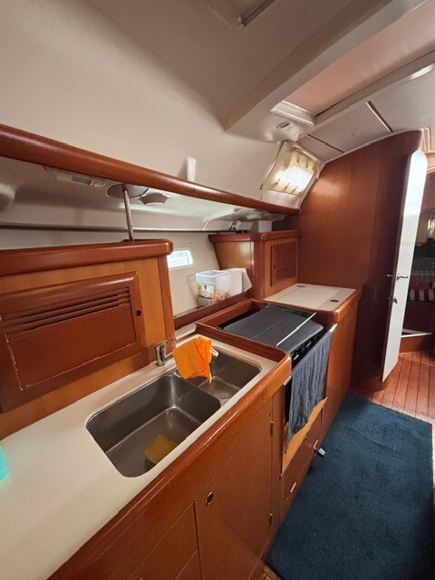 A l’intérieur , une cuisine longitudinale équipée d’une cuisinière/four, réfrigérateur avec congélation, un double évier en acier inoxydable avec eau chaude/froide sous pression, robinet de pompe à pied.
