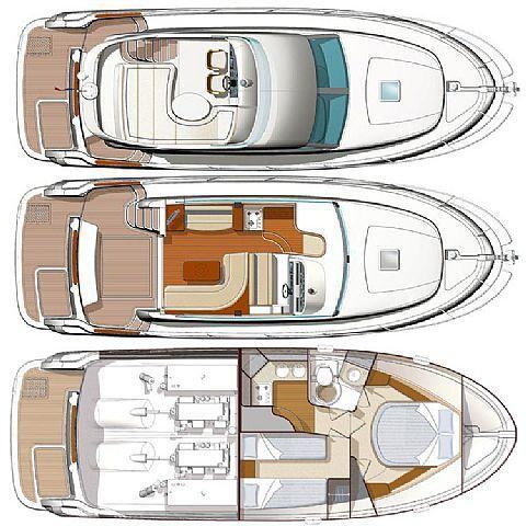 1 Cabine double avant. 1 Cabine double sur tribord, deux couchages simples ou un couchage double. 1 Cabinet de toilette WC marins, douche, lavabo, avant bâbord. 1 Cuisine en long sur bâbord. 1 Poste de pilotage sur tribord. 1 Carré en L sur tribord. 1 Banquette sur bâbord.