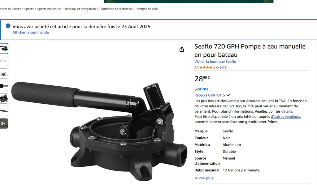 Pour tenter de régler ce problème j'ai acheté cet été une pompe à main sur amazon (photo en annexe) que je compte fixer sur la cloison à l'arrière du moteur, le tuyau qui aspire placer en fond de cale moteur et le tuyau qui évacue en libre dans la cale moteur pour être placé dans un seau quand je pompe.
