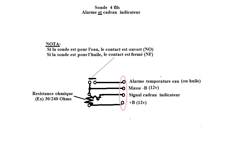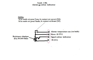 Les bornes pour l’indicateur cadran est en principe une résistance (thermistance) ohmique variable (0/180 ohms ou 30/24O ohms), alors que l’alarme est immédiate dés la température eau atteinte.