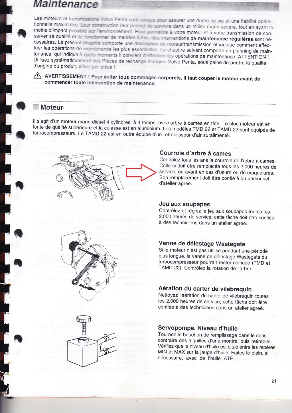 Le manuel de réparation du Volvo MD 22 / TMD 22 / TAMD 22 préconise le remplacement de la courroie de distribution toutes les 2000 heures.