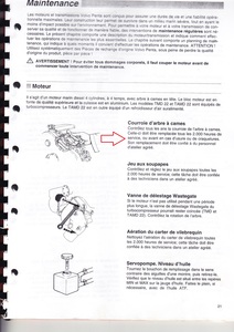 Dans le manuel du propriétaire à partir de la page 20 a 25 il y a le détail de l'entretien. Important, il faut changer la courroie de distribution à intervalles réguliers ( chaque 3 ans )