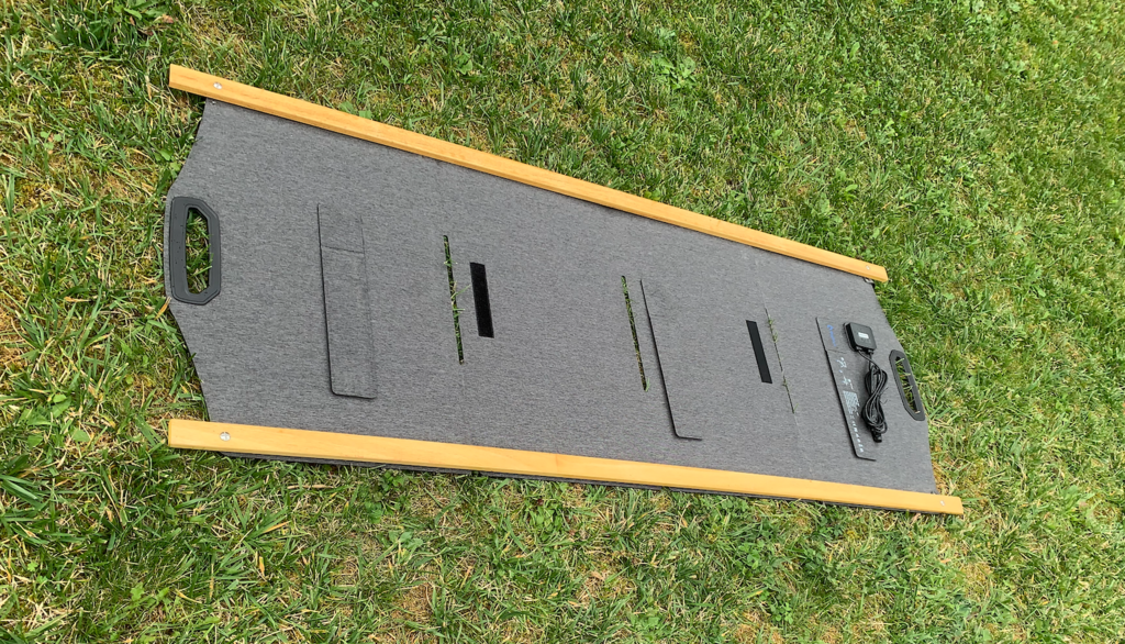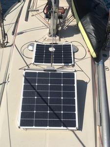 Comme j'ai un power pack (dont je ne dirais pas la marque), avec ses 200W de panneaux pliables, je viens de les monter sur deux lattes. L'ensemble reste un peu souple, assez pour être posé sur le bimini temporairement lors d'un mouillage. Reste à voir comment les sécuriser.