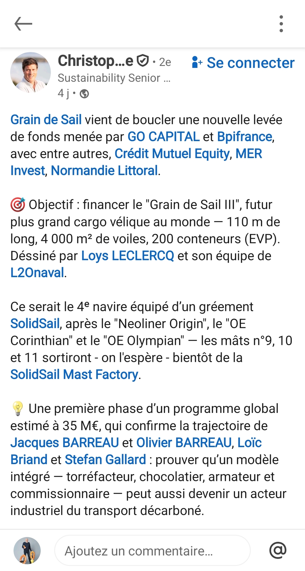 Panoramix_bzh:@Peace and Love Moi aussi je trouve ça très bien les ESAT. A lire certains le transport à la voile ne peut vivre qu'avec les subventions alors que Grain de Sail montre le contraire. C'est sûr ce n'est pas demain qu'on va transporter du minerai à la voile mais si le chocolat est transporté de manière décarbonée et fait vivre des personnes en situation de handicap, c'est ça de gagné!!! Il faut comprendre que les entreprises dépensent une fortune en marketing et un petit pourcentage en plus sur le transport pour se mettre en avant est un super investissement, voire un moyen d'avoir un budget marketing plus contenu. Après ça veut aussi dire que des bureaux d'études Français montent en compétence et que quand ils deviendront meilleurs que la moyenne ils seront en position de vendre leur savoir-faire ailleurs ce qui ne peut être que bon pour le pays. Je sais que le savoir faire technique c'est passé de mode mais ça fait quand même vivre des gens et en plus n'empêche même pas les autres de faire de l'argent pour l'argent. On ne va pas battre les Chinois en les imitant, en plus ils ont profité de tous les abrutis qui disaient que les panneaux solaires ça ne marcherai jamais pour s'imposer comme les leaders. Peut être qu'un jour on va apprendre....·le 16 nov. 15:52