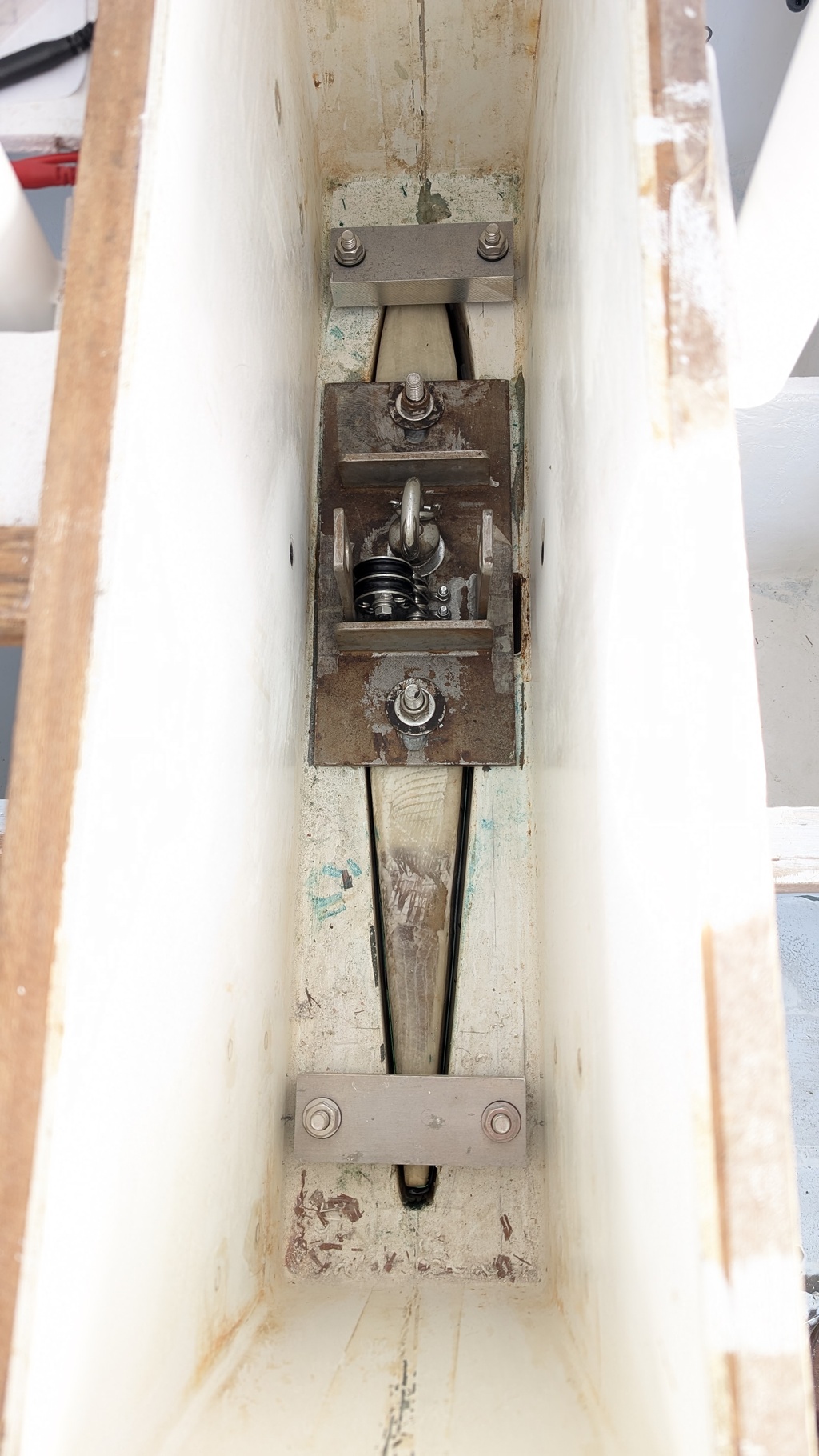 J'ai un barreaux de blocage au dessus de la quille sous forme d'une tige fileté inox et qui participe à la restriction de mouvement longi&lateral (même si je suis pas sur que le système soit fait pour que des efforts passent par là)