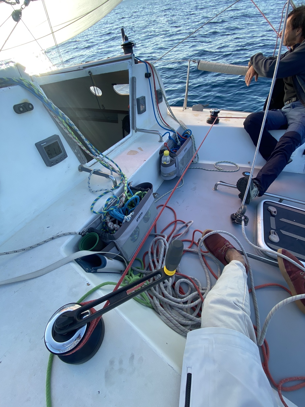 j’utilise le winch sous le vent pour renvoyer l’écoute de spi vers le winch au vent à côté du barreur