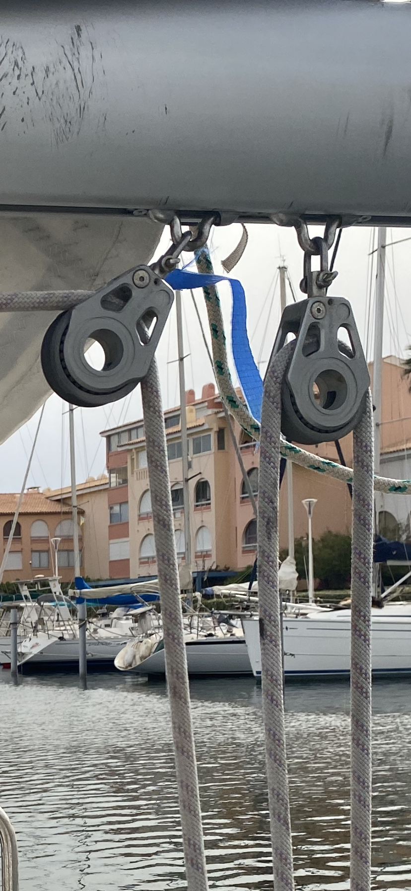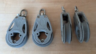 La première poulie est une Antal OPF50 à sangler (MWL 600 Kg), la deuxième une Allen 2030HL (MWL 300 Kg) et la 3ème une Ronstan Orbit 20 (MWL 200 kg).