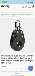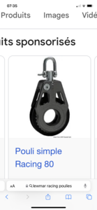 J’ai commandé mes poulies pour le palan à main des bastaques j’ai pris dès violon et violon rîngot , plat pont de la série élément harken en 45 joues alu que j’avais pris sur le halebas et qui sont très bien