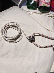 Donc la drosse passe dans l'anneau.... Le sandows de 50cm permet de tendre la drosse sans fin à l'arrière du cookpit le long du rail de fargues en s 'aidant par exemple d' un pied de chandelier puis l'excédent de sandows permet de bloquer la drosse par des tours morts autour des deux retour de drosse.... Oups jean..