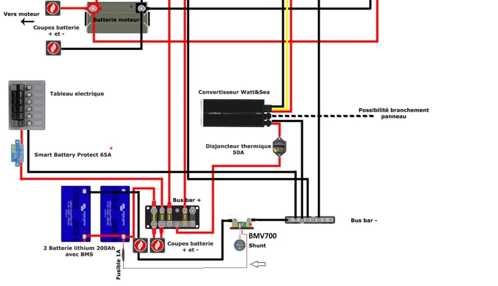didier.brest:« sauf alim BMV qui doit pouvoir être alimenté même si CB ouverts »Pourquoi ? Ça fait une consommation permanente de quelques mA. Dans ce cas, il faut que le coupe-batterie négatif soit en aval du shunt.·le 12 sept. 10:31