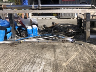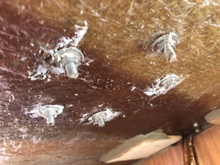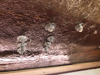 2 vis de main courante alu bâbord qui ne veulent rien savoir empêchant d’enlever le vaigrage bâbord qui, génial! est un seul panneau de 4 m de long! en Cp de 5mil plus mousse plus sky: ingérable la place que ça prend dans le bateau.