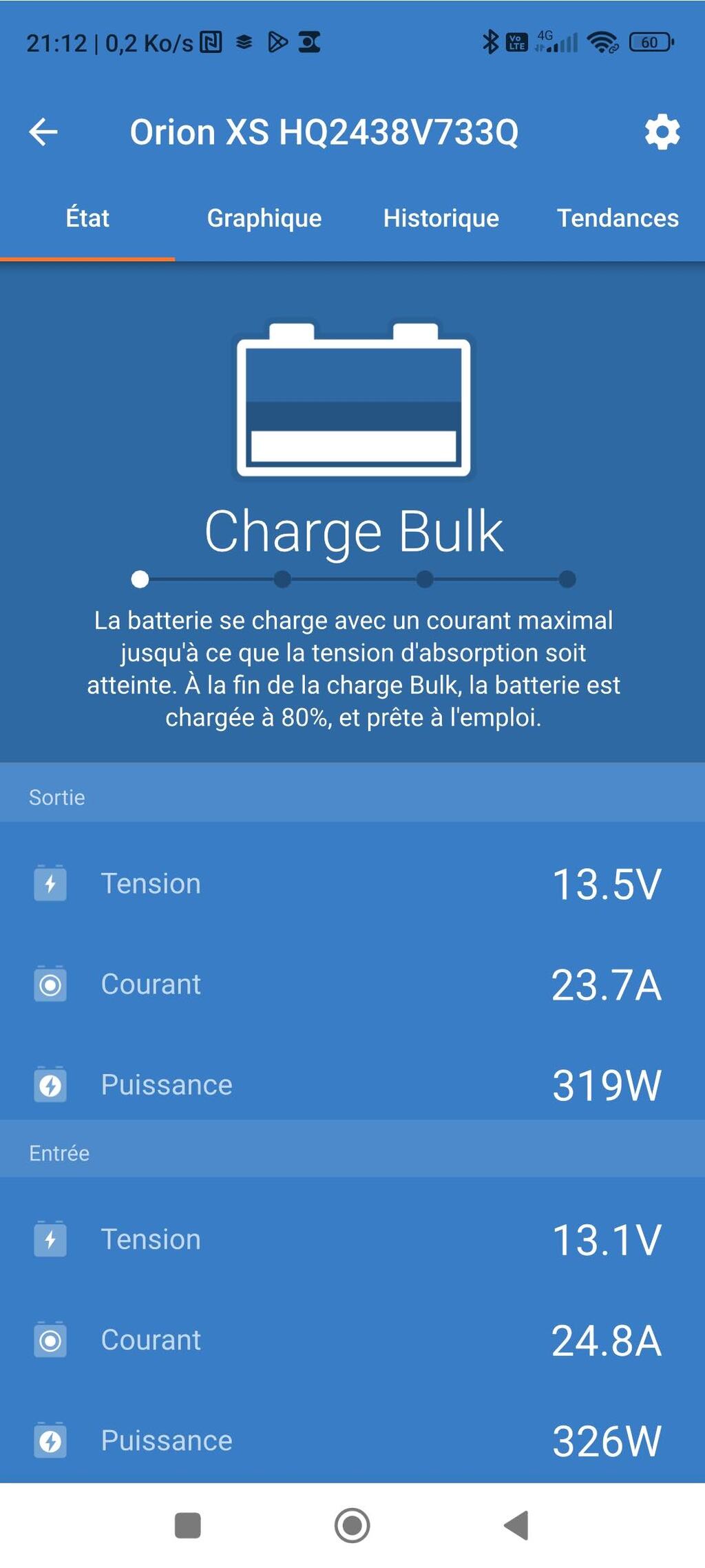 Par contre mon chargeur à quai qui est un TBS électronique OC 12-60 charge lentement et envoi que un courant de charge de 4Ah si je démarre le moteur j'ai un courant de charge de40Ah