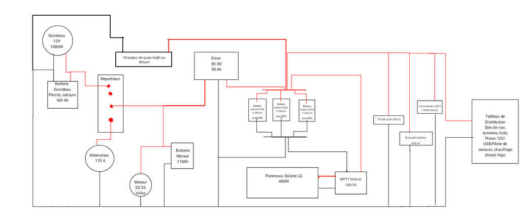 Fabien83:Salut, pour les raisons indiquées plus haut, le branchement de l'Orion sur le schéma de droite n'est pas bon selon moi. Je ferais le schéma de gauche. Dans chacun des schémas, le chargeur de quai ne recharge pas les batteries plomb. Ton chargeur de quai a une seule sortie ? S'il a deux sorties ou plus, je les brancherais sur la batterie guindeau et batterie moteur. S'il n'a qu'une seule sortie, je la brancherais sur l'entrée du répartiteur, là où est branché l'alternateur.·le 15 nov. 07:00