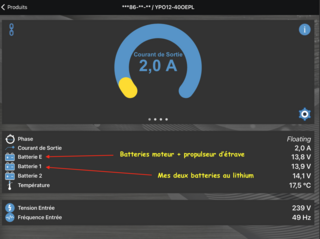 tronegeden:Merci pour cette réponse un Dimanche matin !!! :-) Ha….je vois le problème avec mon chargeur Cristec 40Amp ….. c’est qu’il est plus ancien: le paramétrage des sorties est global, donc les batteries doivent être du meme type. J’ai donc le choix: soit je me passe du chargeur de quai pour ma batterie de service (pas possible)soit je change mon chargeur de quai qui fait la différence entre type de batteries (upgrade Cristec)soit je conserve mon chargeur de quai et je prend un chargeur uniquement pour la batterie Lithium de service .Bon il y a deux autre pistes: 1-brancher le chargeur en entrée du répartiteur (et là je ne sais pas si c’est possible)2-ou alors c’est l’Orion XS qui gère l’arrivée du chargeur de quai réglé sur Plomb/AGM et qui adapte en sortie sa chargeur pour du Lithium.Bon….y’a de la réflection dans l’air :-)Merci pour ta réponse. ·le 16 nov. 10:05