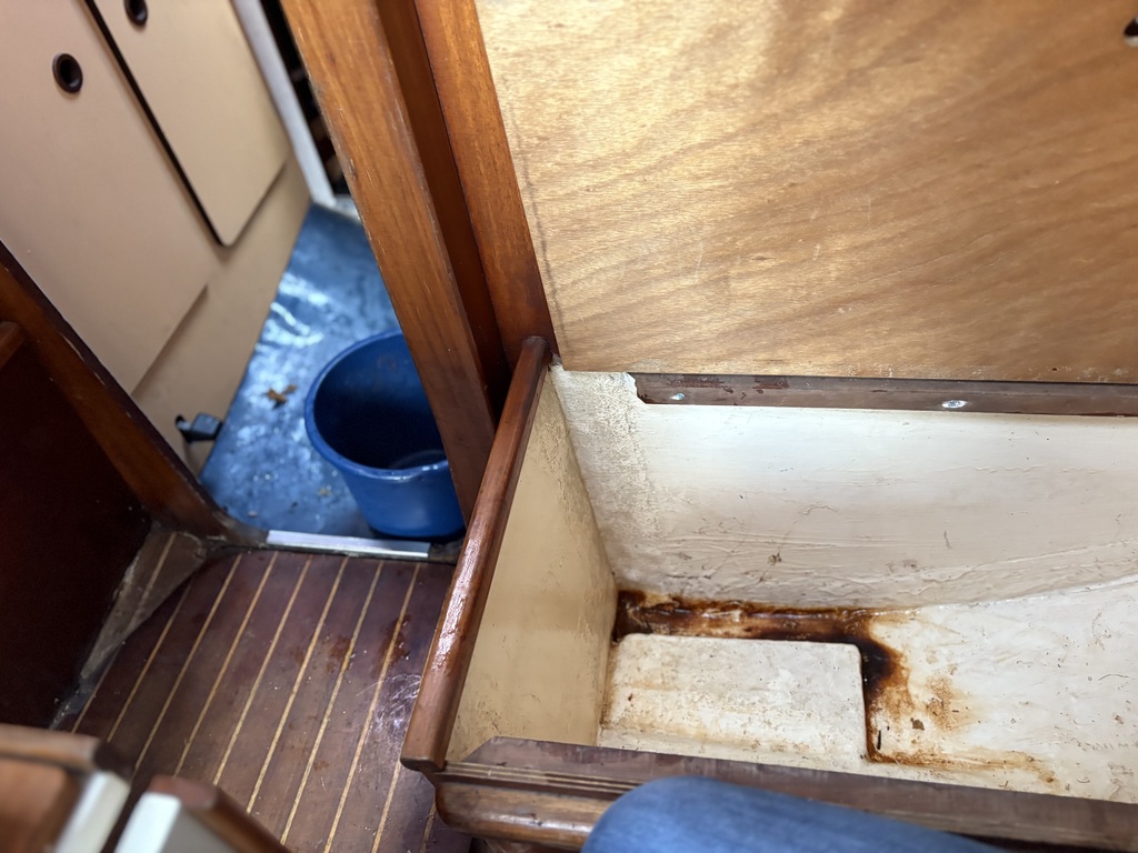 Je cherche à comprendre à quoi correspond là protubérance stratifiée dans le fond du coffre sous la banquette du carré, à droite de la porte menant à la cabine avant.