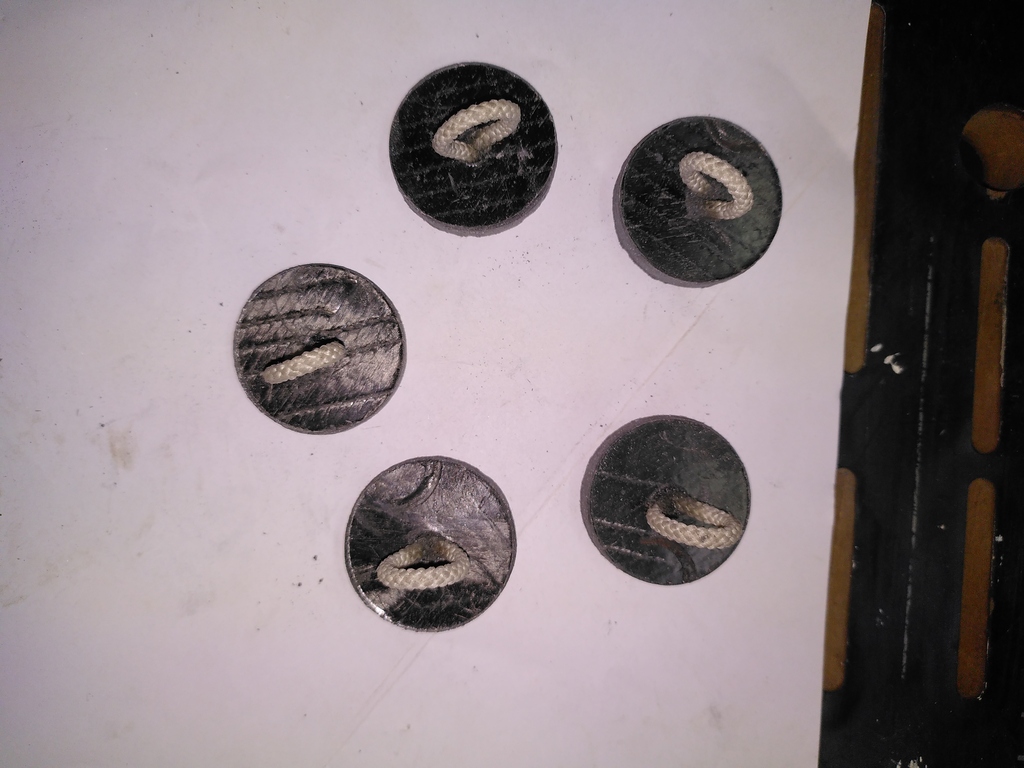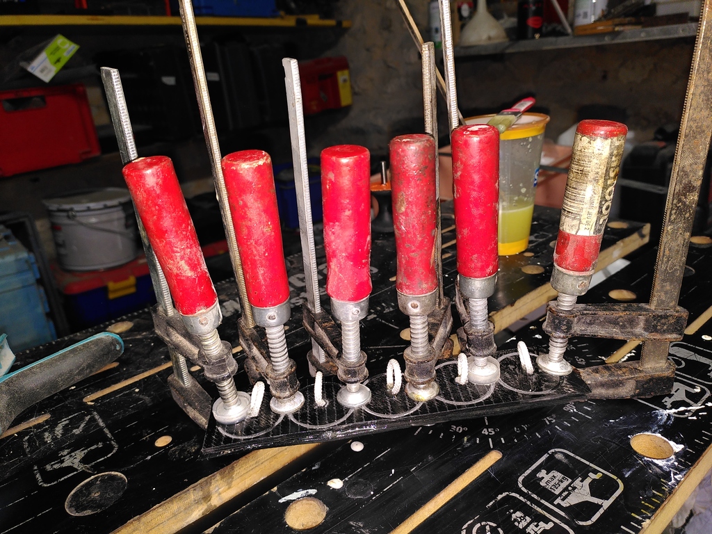 Perso, je fais les miens avec 2 plaques et je les colle au Sika de part et d'autre des cloisons selon les cas. Le dyneema c'est costaud mais c'est loin d'être immortel, autant pouvoir les changer quand la vie a été trop dure avec eux.. J'ai fabriqué une petite presse très simple dans laquelle je peux en fabriquer 6 en même temps. Je fais directement les disques à la perceuse sur colonne (avec un foret pour les plaques du dessus et sans foret pour les plaques de fond). J'aime le carbone donc je met deux petites couches de sergé, je teinte la colle epoxy en noir et je vernis les parties extérieures. Il y en a toujours 4 à 6 à bord, au cas où (avec autant de manilles textiles qui sont aussi un chouette petit bricolage hivernal)