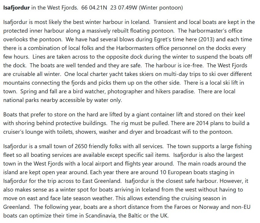 Ici en annexe ce que le site Noonsite dit de Isafjödur comme port pour hiverner, j'envisage un hivernage sur bers, bateau démâté.
