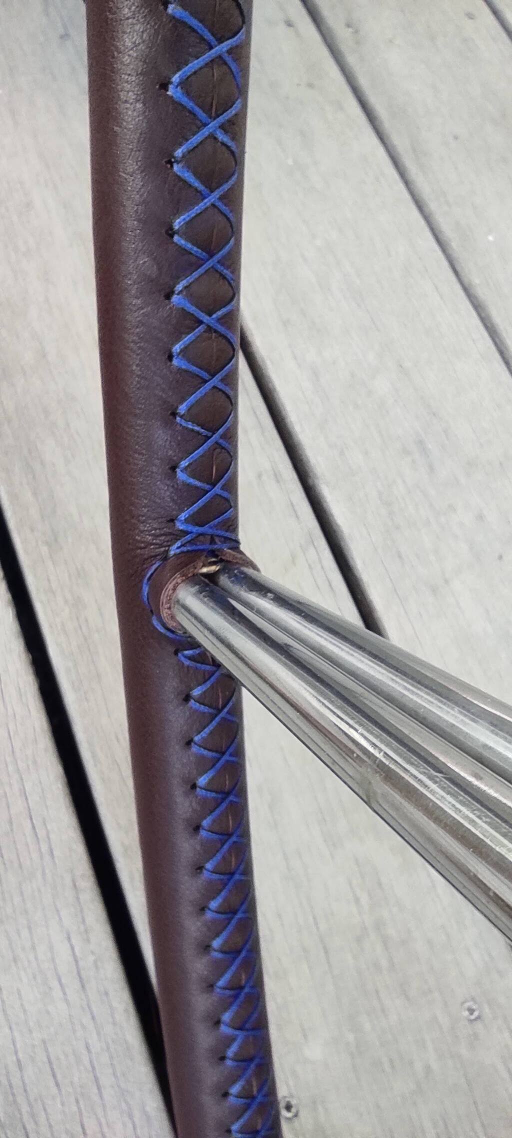 ConstanceD:Non, pas mouiller, mais la bonne longueur. Pour un volant de voiture le diamètre du cercle que forme le cuir est au maximum égale au diamètre intérieur du volant. Une barre à roue étant bien plus grande qu'un volant, le diamètre est encore plus petit. Le cuir est élastique, il ne doit pas faire de plis là ou les deux bords se rejoignent pour la couture. Le plus souvent, le cuir est préalablement collé sur la barre avant d'être cousu pour éviter qu'il ripe sur la barre une fois mouillé·le 20 oct. 08:14