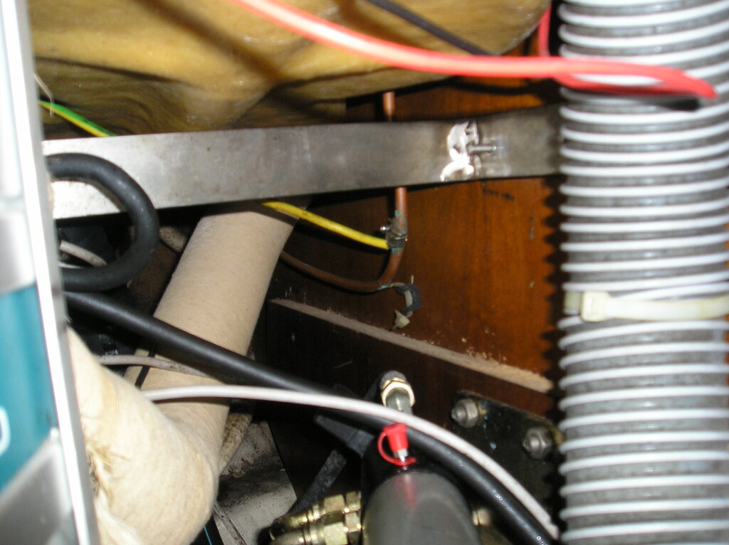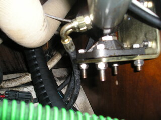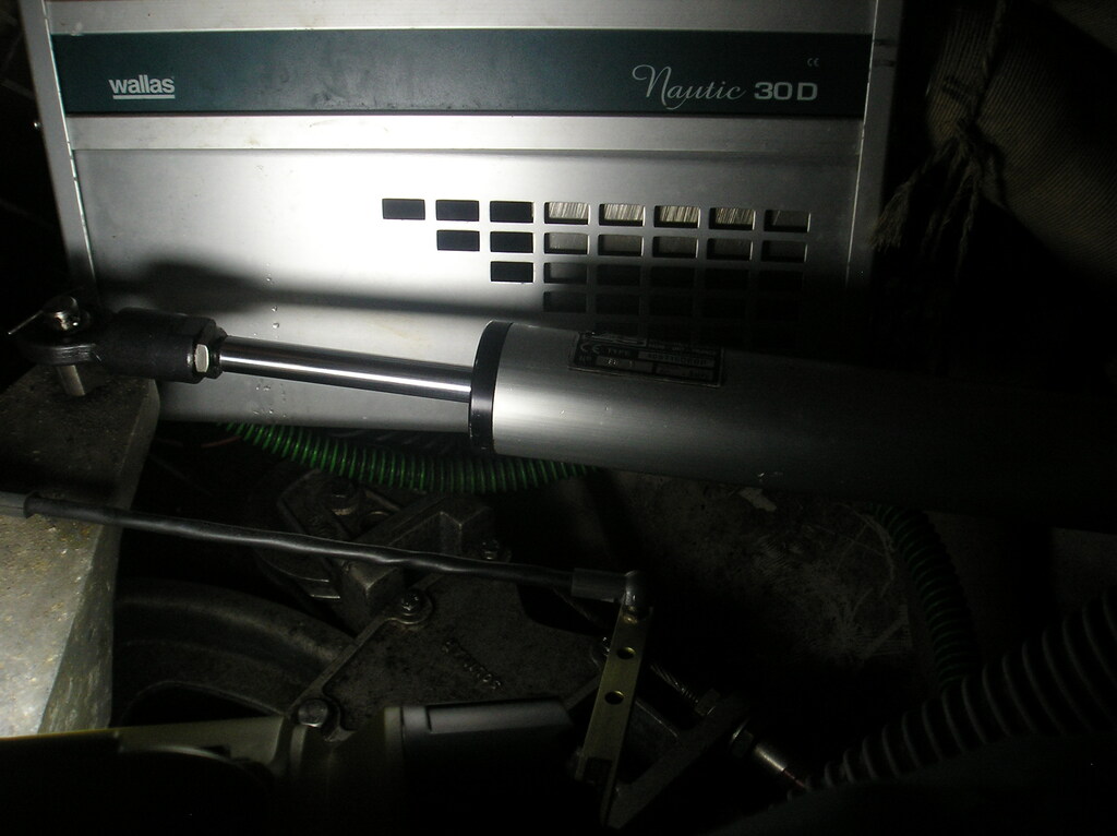 Actuellement, je suis sur mon boat et comme promis Je t'envoie les photos que je viens de prendre afin de te donner une idée de l'installation du vérin de pilote. le vérin est fixé d'un coté sur la cloison de la cabine arrière et de l'autre sur un bras au dessus du secteur de barre.