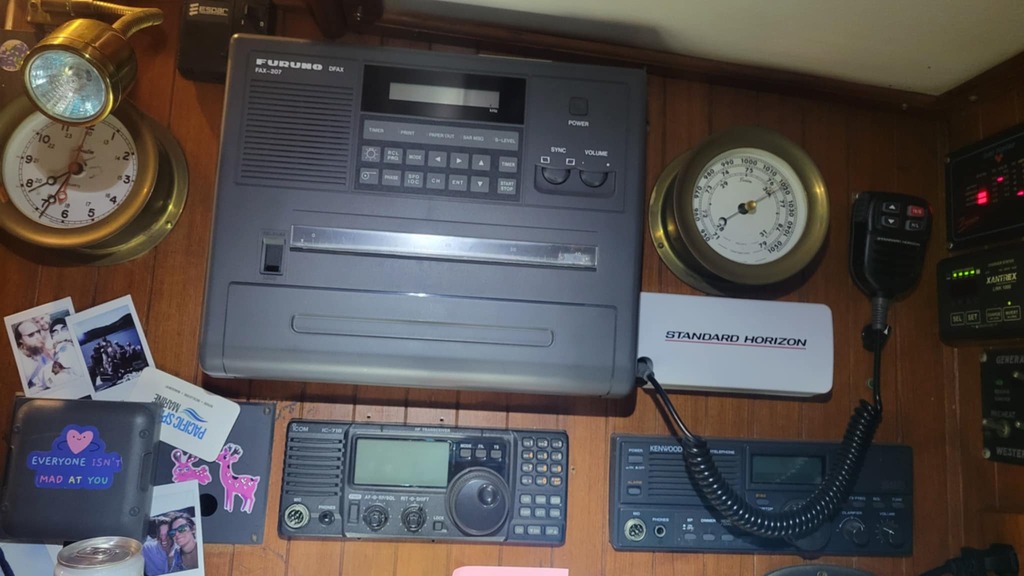 Sur la photo jointe à ce message, on peut voir un fax, une SSB et une radio HF (ainsi qu’une VHF que je viens d’installer pour remplacer une ancienne obsolète).