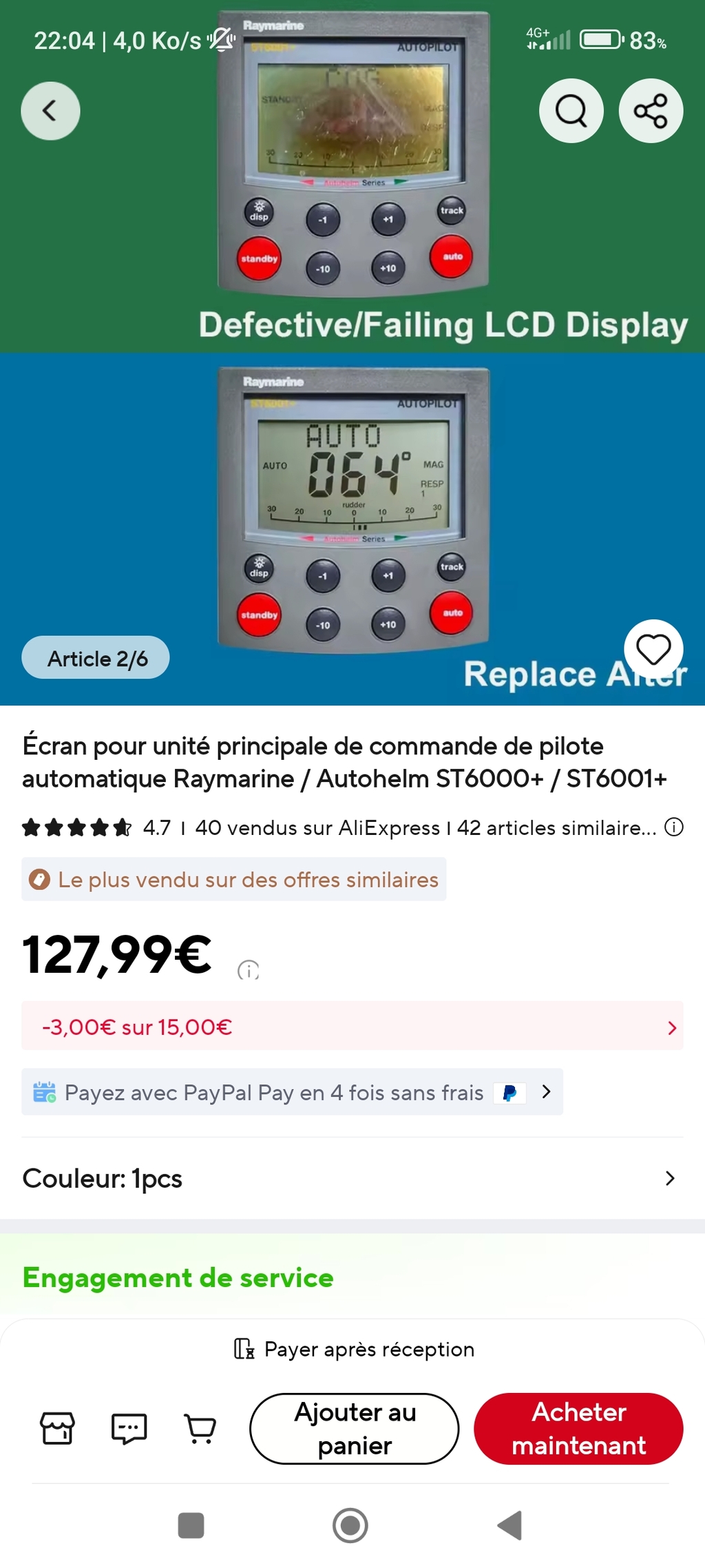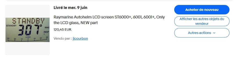 L ecran de mon pilote etait cela, achat de l ecran sur ebay (en 2021, nom du vendeur sur l image), la il est comme neuf. J ai verifie j ai depuis remplace aussi l ecran du log Raymarine (mais st50), meme vendeur.