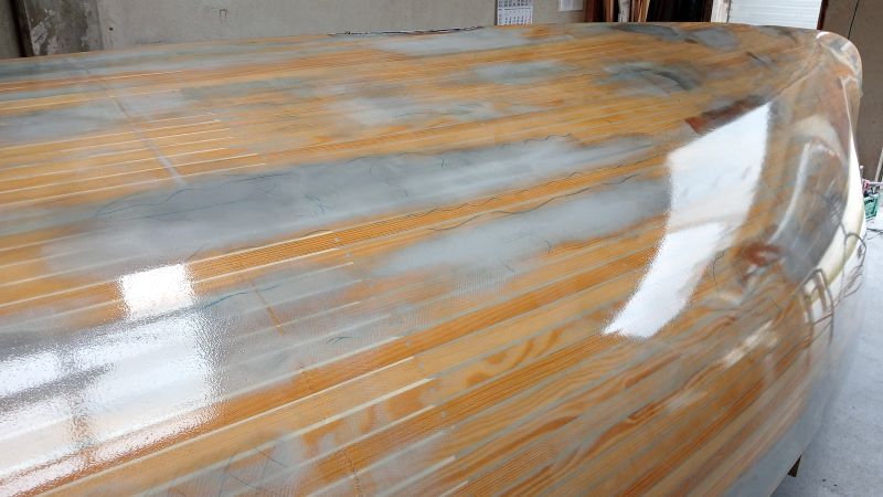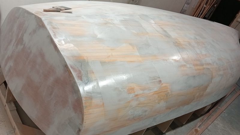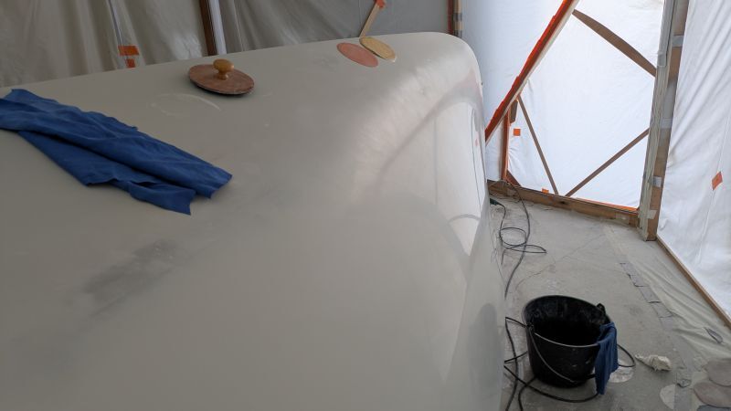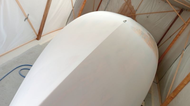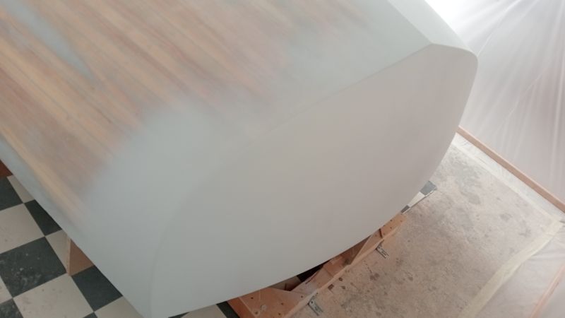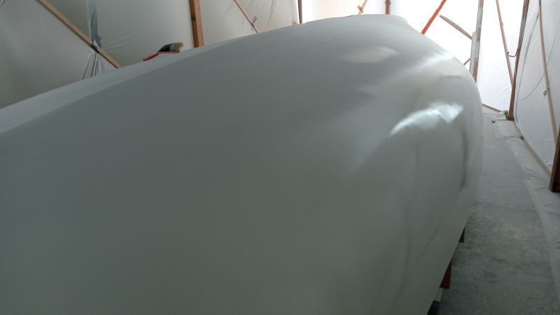 Reprise de l'apprêt le 24 juin, mais il y a de nombreux grattons à poncer, et beaucoup de trous d'épingle datant de la stratification à mastiquer.