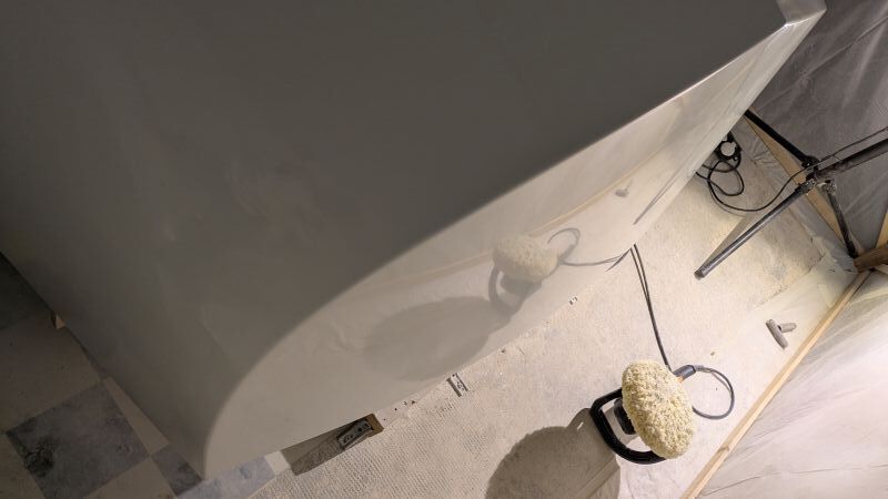 Mais le polish avec une grosse polisseuse réglée à vitesse assez lente. Assez physique, faut la manier, la bête.