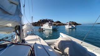 Mouiller son ancre, l'idéal serait d'oringuer au cas on l'ancre se glisse dans une des chaines des mouillages des locaux. Comme il n'y a pas beaucoup de place personne oringue. J'ai déjà dû aller plonger pour aller décrocher mon ancre. En avril, sans combinaison, c'est pas le plus agréable. Il y a un trou à l'abri des courants, mais il faut connaître pour bien se positionner. Je déconseille de tenter le coup une première fois. Il faut prendre ses propres repères.
