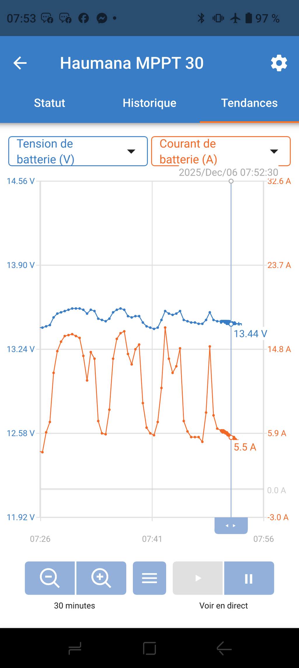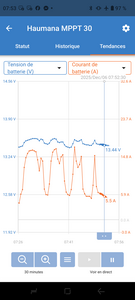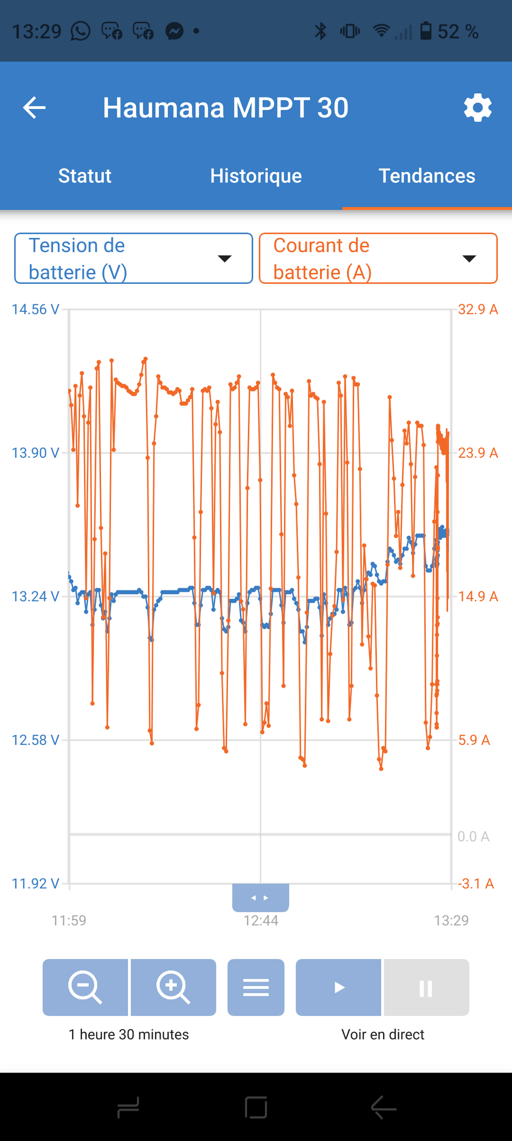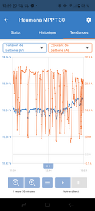 Une semaine avant l'arrivée de nos nouvelles batteries je fais la mise a jour du MPTT car nous passons au lithium et je veux que tout soit avec la bonne version, a partir de ce moment là on remarque de grosses fluctuations de courant, pourtant j'ai rien changé, je suis toujours réglé sur batterie au plomb, la seule nouveauté c'est la mise a jour de mon MPTT 100/30 a la version v1.68
