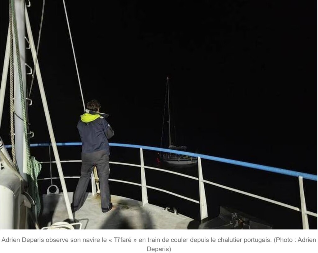 PierMi:S'il s'agit bien du Ti Fare renseigné comme perdu le vendredi 10/10/25, alors il y a encore un "journaleux" de TF1 qui est fâché avec la géo. 45 Nm au large de Peniche: Il y a loin jusqu'à Madère. Faire du sensationnel et dramatiser en élargissant la zone ? C'est ce genre de "journaleux" qu'il faudrait fixer à nos safrans.·le 25 oct. 16:31