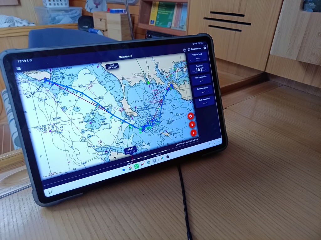 Les photos sur tablette 12 pouces Android 15 en mode PC multi-fenêtres. sur la table à cartes de mon bateau