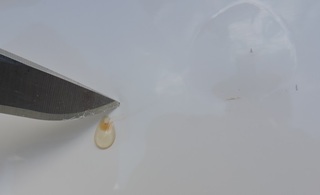 @Titimarin :Vécu : les taches noires... ce sont des cloques d'osmose! il faut sécher, percer les cloque pour les vider, rincer, sécher suffisamment longtemps, éventuellement passer un coup de rabot électrique (ce que j'avais fait) enfin nettoyer, rincer, sécher puis appliquer une couche d'époxy alimentaire... Bon courage!