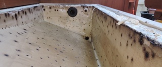 Après nettoyage et javel ca donne ce que vous voyez en photo (intérieur) : C'est globalement propre sauf le revêtement des cloison qui part en plaques. Je n'ai pas essayé l'eau oxygénée mais ce sera la suite car :