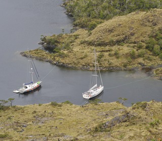 Pour les mouillages, ce fut sur ancre sur la moitié des mouillages ou sur ancre avec des amarres à terre selon la configuration du mouillage et du vent annoncé, souvent avec 2 lignes à terre, parfois 3 mais à Brecknock nous en avions 4 et même 5 à Pozo Inesperando (55nds enregistrés à Puerto Aguirre !) …ça a fait le job !...Il est certain qu’un équipage à 2 a beaucoup de travail et requiert une excellente coordination entre les différentes manœuvres (ancre, maintenir au moteur le bateau, annexe ou kayak à mettre à l’eau puis installer les lignes ….). A 3 c’est plus simple et 4 c’est le luxe !...
