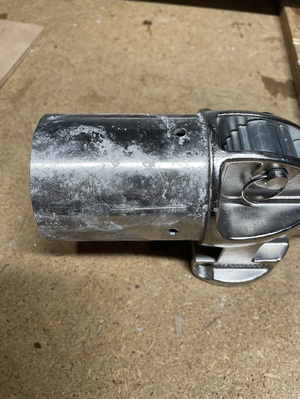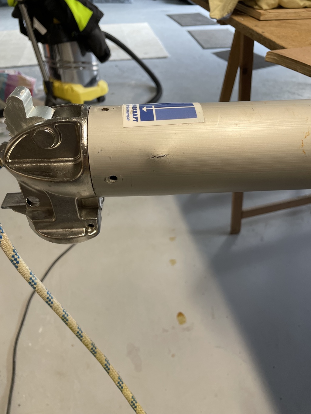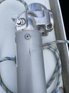 Autre interrogation et avis bienvenus. Il faut savoir que lorsque l'espar n'est pas utilisé il est positionné sur le pont et bloqué grâce à des pions vissés sur le pont. Quand on regarde le montage au repos on s'aperçoit qu'il y a un une pente négative de l'avant du bout vers l'arrière. Donc si humidité ou pluie, ça taille vers l'arrière, là ou j'ai eu le problème d'électrolyses. Je ne crois pas au hasard ....