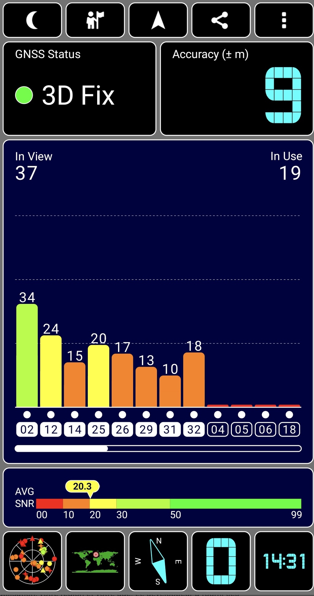 Ici je te montre une précision de 9 mètres avec 37 satellites visibles et 19 utilisés sur un smartphone