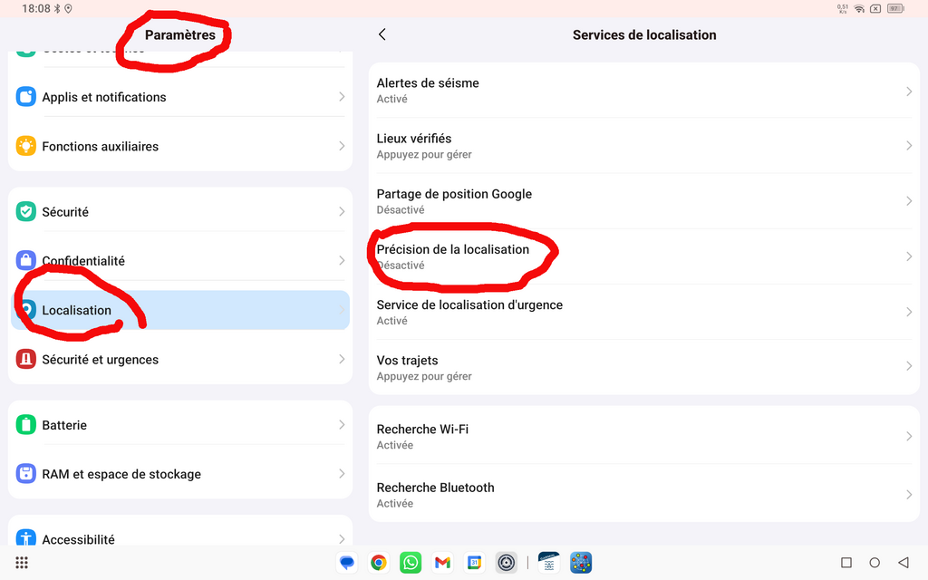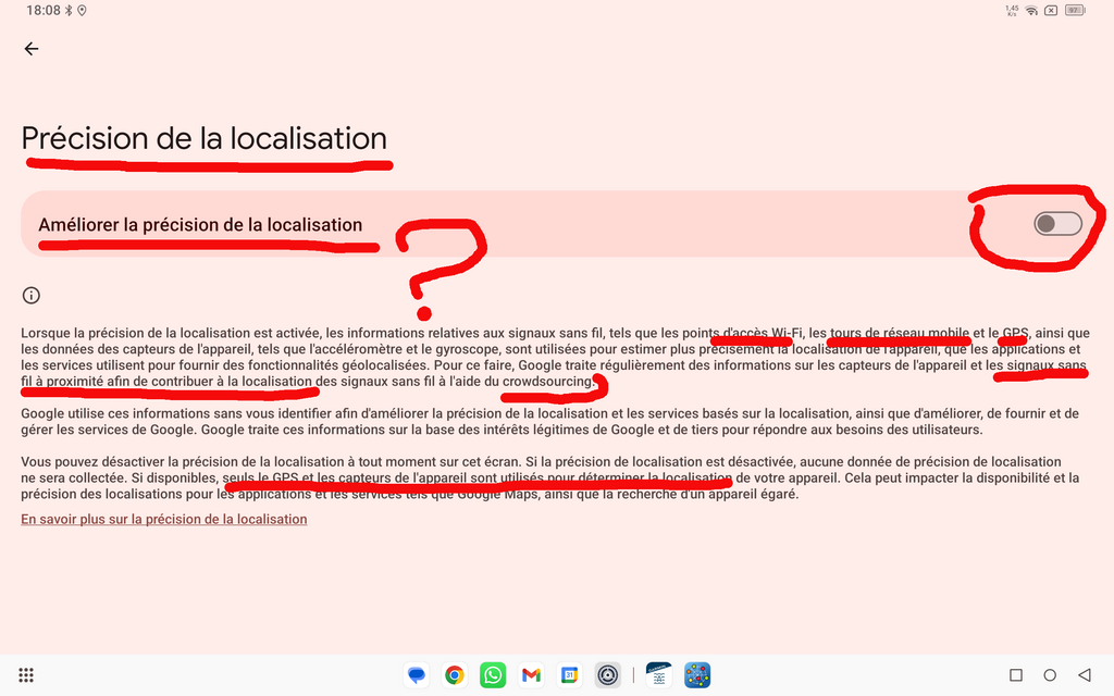 "Désactive la "localisation précise" par prudence car au large on en a pas besoin, et en côtier en général tu ne captes qu'une seule antenne GSM en général ce qui va donner un décalage de position pour les applications autres que celles de navigation maritime."