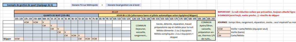 L'idée étant en début de nuit de mettre un équipier seul de 21H à 00h pour la gestion de la veille (barre) et travail sur carte/meteo, puis après faire des 1/4 roulants : Equipier 1 à la barre, Equipier 2 se lève et va à la carte/météo puis équipier 1 se couche pendant que équipier 2 passe à la barre et que équipier 3 se lève pour la carte/Météo etc...