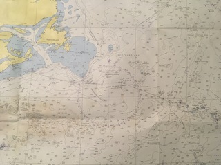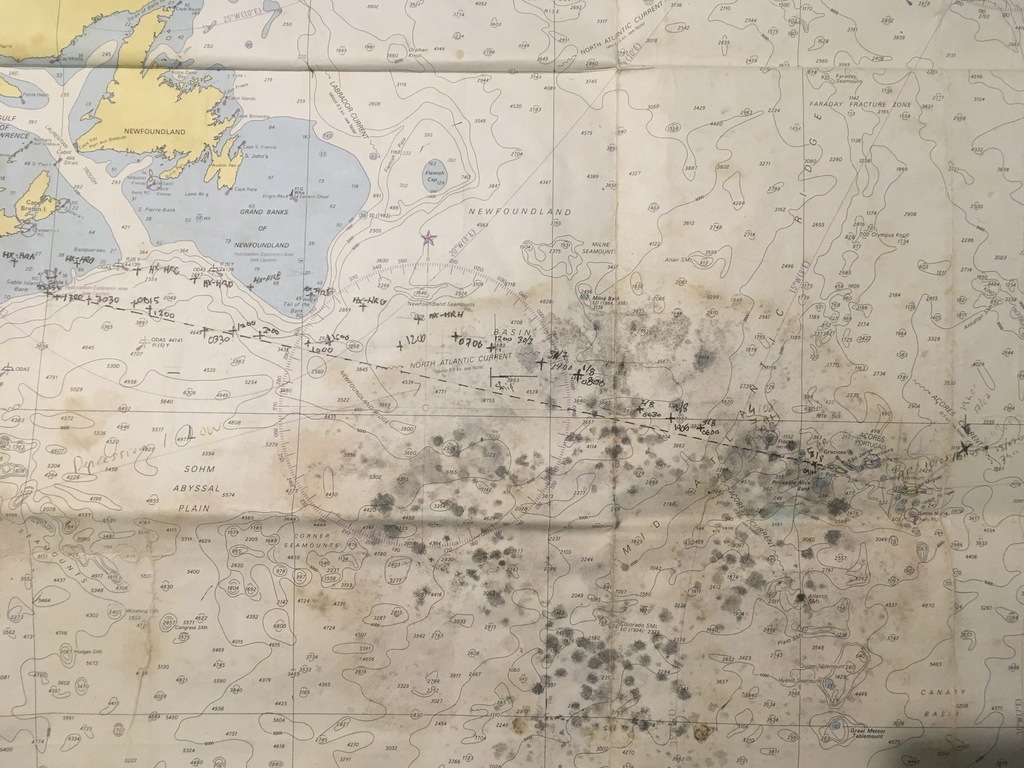 Exemple de routier que je ne peux regarder sans émotion, la carte « propre est celle que mon épouse remplissait au fur et à mesure des sms, la carte qui a pris de l’eau salée… à l’interet de montrer une série de waypoints correspondant à l’orthodromie mais on s’en est vite écarté car c la route très fréquentée des cargos !! Pas trop loin pour communiquer en VHF. Mon excellent navigateur avait créé une route ortho sur le brave Garmin 12 xl