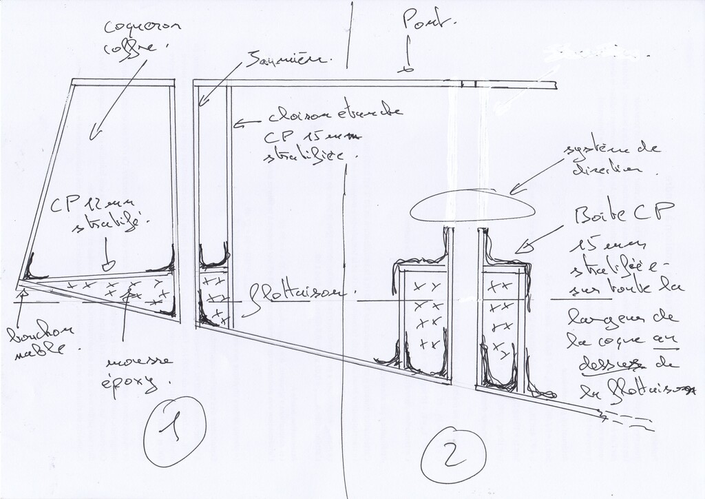 La configuration de la jaumière dans le coqueron permettait de faire un plancher au dessus de la flottaison. La cloison initiale, trop légère, a été détruite et remplacée par une beaucoup plus épaisse en 15 mm, stratifiée sur les deux côtés.