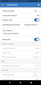 Alors, oui, avec les SmartSolar on peut configurer comme suit. J'ai mis des recopies d'écran. Je suis encore à me demander s'il faut activer le courant de queue (je ne sais pas ce que c'est), paramétrer la tension d'égalisation (je l'ai pas fait non plus)??