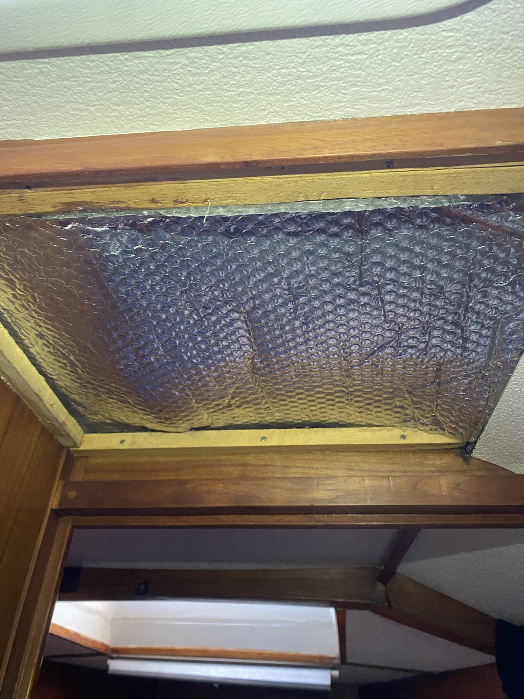 L’isolation actuelle est constituée de plaques de polystyrène de 30 mm recouvertes d’une couche de papier bulle. Cependant, cette isolation n’étant pas en contact direct avec la coque, elle laisse se former de la condensation entre le polystyrène et le métal.