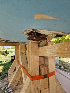 xatophe:Si on prend le chantier tel qu'il est sur la photo on voit 2 "tour" d'une hauteur de 4 parpaings + quelques chevrons. On double une des 2 tours par 3 parpaings, on pose le cric dessus. A partir de la on peut rajouter ou retirer un chevron. Comme le bateau est soutenu en son centre il montera ou descendra d'une hauteur d'un demi chevron. Faire la même opération de l'autre coté, puis à l’arrière. Vu la faible hauteur de déséquilibre à chaque opération le bateau ne glisse pas, par contre c'est un peu long. Sur la photo la remorque vient d’être retirée, il faut maintenant refaire l'opération en sens inverse pour ramener le bateau à une hauteur raisonnable pour travailler dessus. Jean ·le 18 mai 2023 23:45