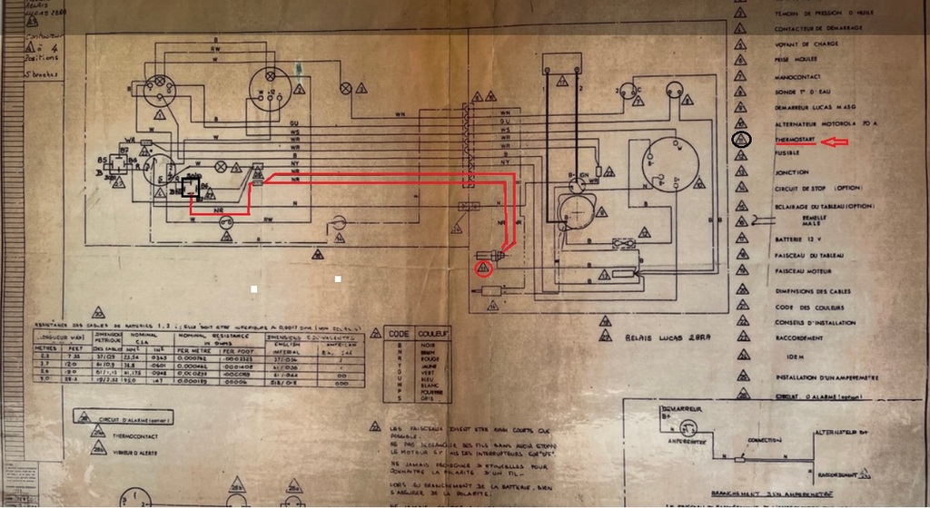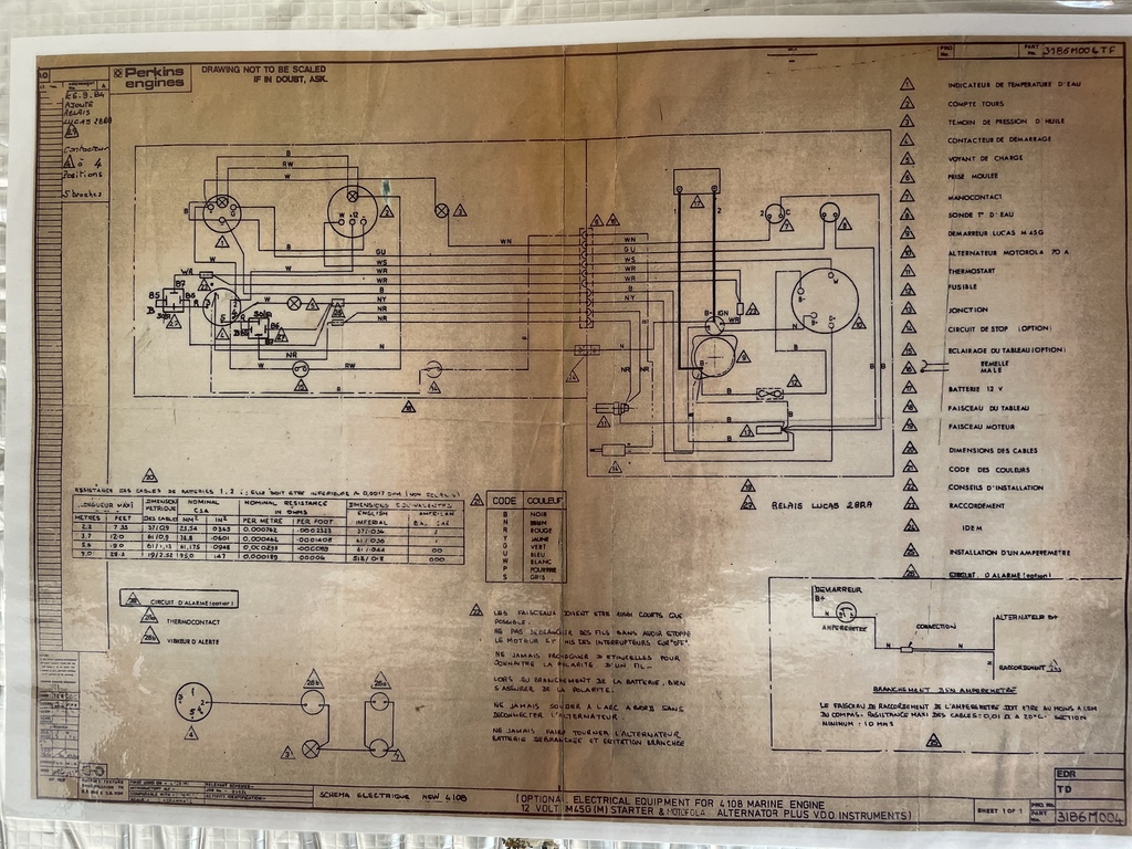 Ci-joint le schéma électrique du Perkins 4108. Près du contacteur à clé se trouve deux relais. Celui de gauche semble être celui du solenoid du démarreur. Mais je n’arrive pas à comprendre à quoi correspond celui de droite. Il est relié à un thermostat. Est-ce l’alarme de surchauffe ?