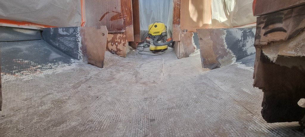 Prochaine étape : Finir de décaper le fond de coque jusqu'à la descente vers l'arrière et la couchette vers l'avant + Décaper les bas de menuiseries sur 20 cms pour les retours de strat du fond et des varangues + décapage des intérieurs de menuiseries pour bien transmettre les efforts le plus "haut" possible.