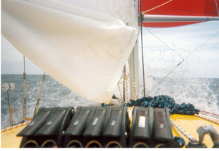 Il nous est aussi arrivé dans une grosse brise de le gréer comme le symétrique, tangon au vent. Pas très joli, mais moins stressant que le symétrique, il y avait vraiment de l'air.