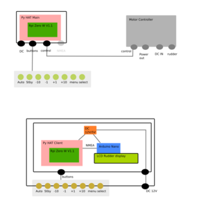 Ensuite, au poste de barre, j'ai un deuxième pypilot "client" qui va me servir pour afficher (via l'écran du HAT) et commander (via des boutons reliés en dur à ce HAT) - les deux py sont reliés en wifi. Je compte rajouter un affichage de l'angle de barre car sur notre bateau c'est très important, du fait que c'est une barre hydraulique avec plusieurs pompes et clapets qui font que la position angulaire de la barre à roue n'est jamais que provisoirement liée à celle du safran (certes, je peux toujours me retourner pour voir la tête de la mèche de safran, mais un retour visuel clair directement au poste de barre est vraiment plus que du confort). Pour ce faire, le capteur de barre sera relié au contrôleur, donc j'aurai l'info circulant en NMEA. J'utiliserai ensuite la sortie NMEA du HAT, reliée à un petit LCD via un arduino (et peut-être un adaptateur série entre les deux).