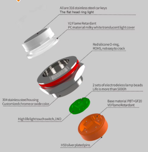 après pas mal de recherches, j'ai trouvé qui sont censés être en inox 316 pour le bouton et en 304 pour le pourtour. Ils sont compacts et restent à peu près abordables.