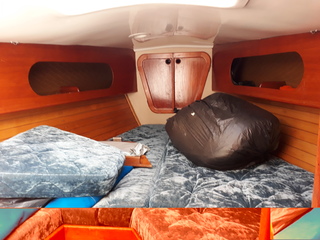 qui avait un vaigrage en lattes d'acajou ajourées. C'était visuellement assez réussi (dans l'esthétique de l'époque !) avec la coque blanche, c'était bien aussi au niveau confort, ça isolait très bien de la condensation de la coque. Mais ça n'était pas démontable, et à la fin de la saison, il y avait derrière (et bien visible) un ramassis immonde de cheuveux, poussière, sable, miettes, débris de toutes sortes. La seule solution pour nettoyer était de vider entièrement le bateau et de passer le Karcher entre chaque latte. Belle galère !